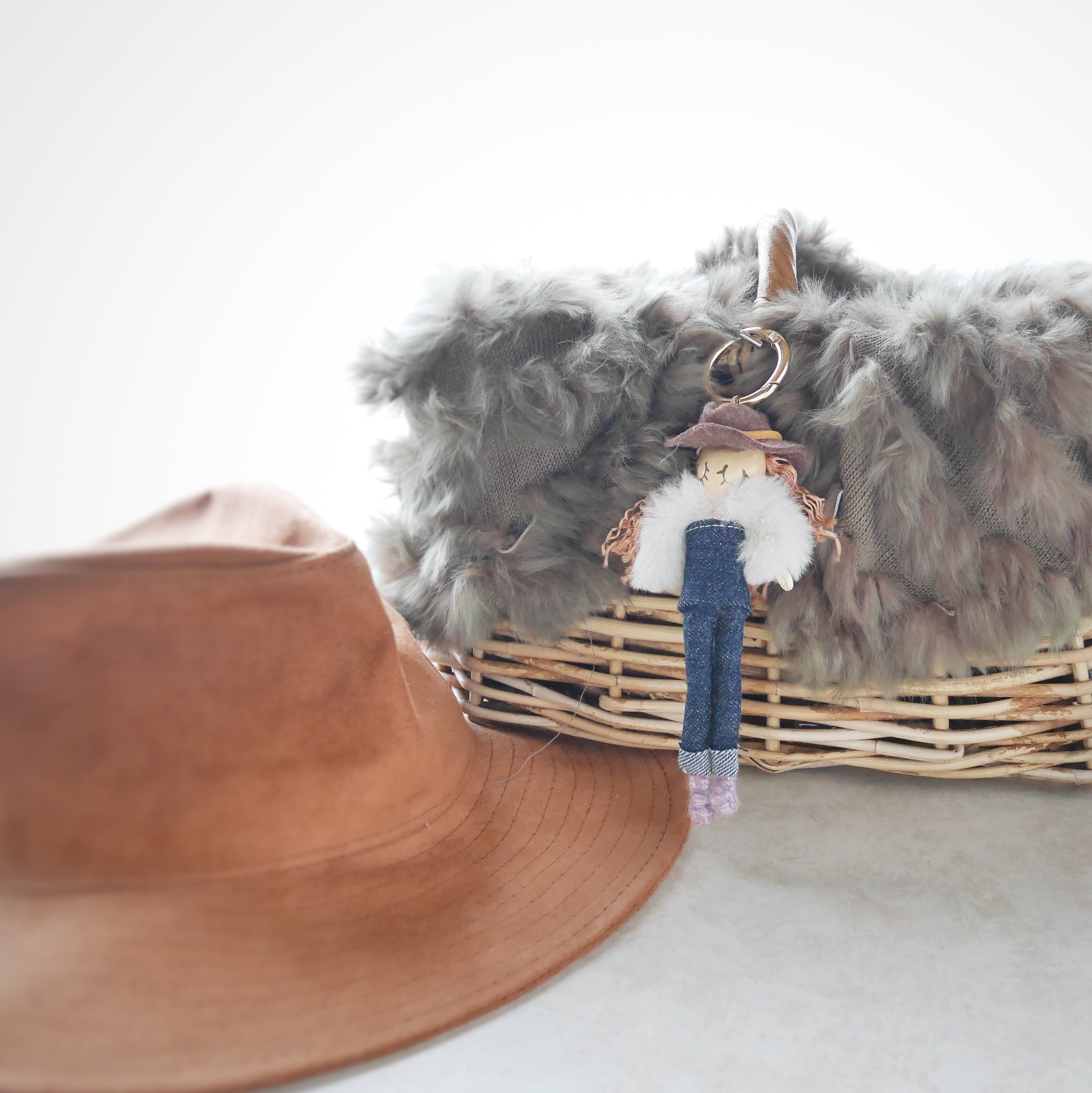 チラ見せのインナーはブーツのカラーとリンクするパラカチェックのラベンダー。お洋服のデザインにこだわりがあるので、どんなバッグに付けても注目度UP♡もしサロペを着る機会があれば、ドールとのリンクコーデもオススメですよ〜