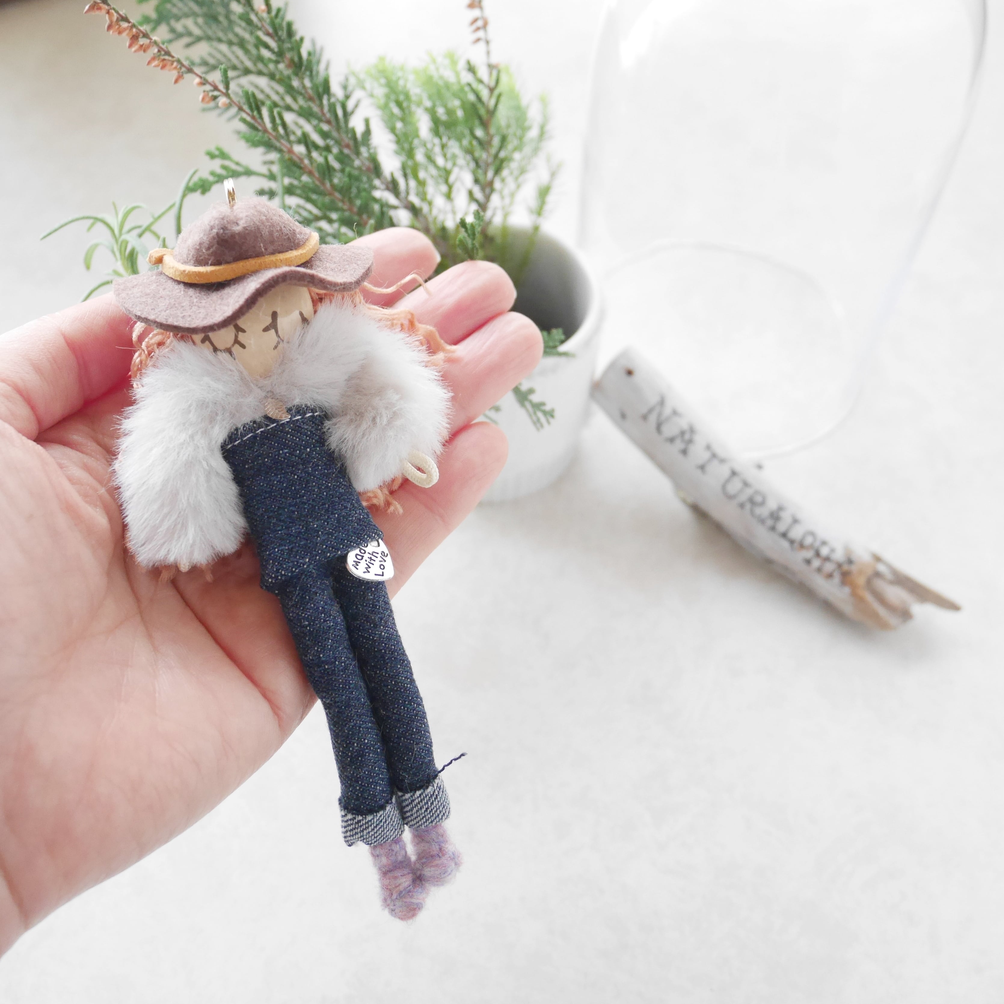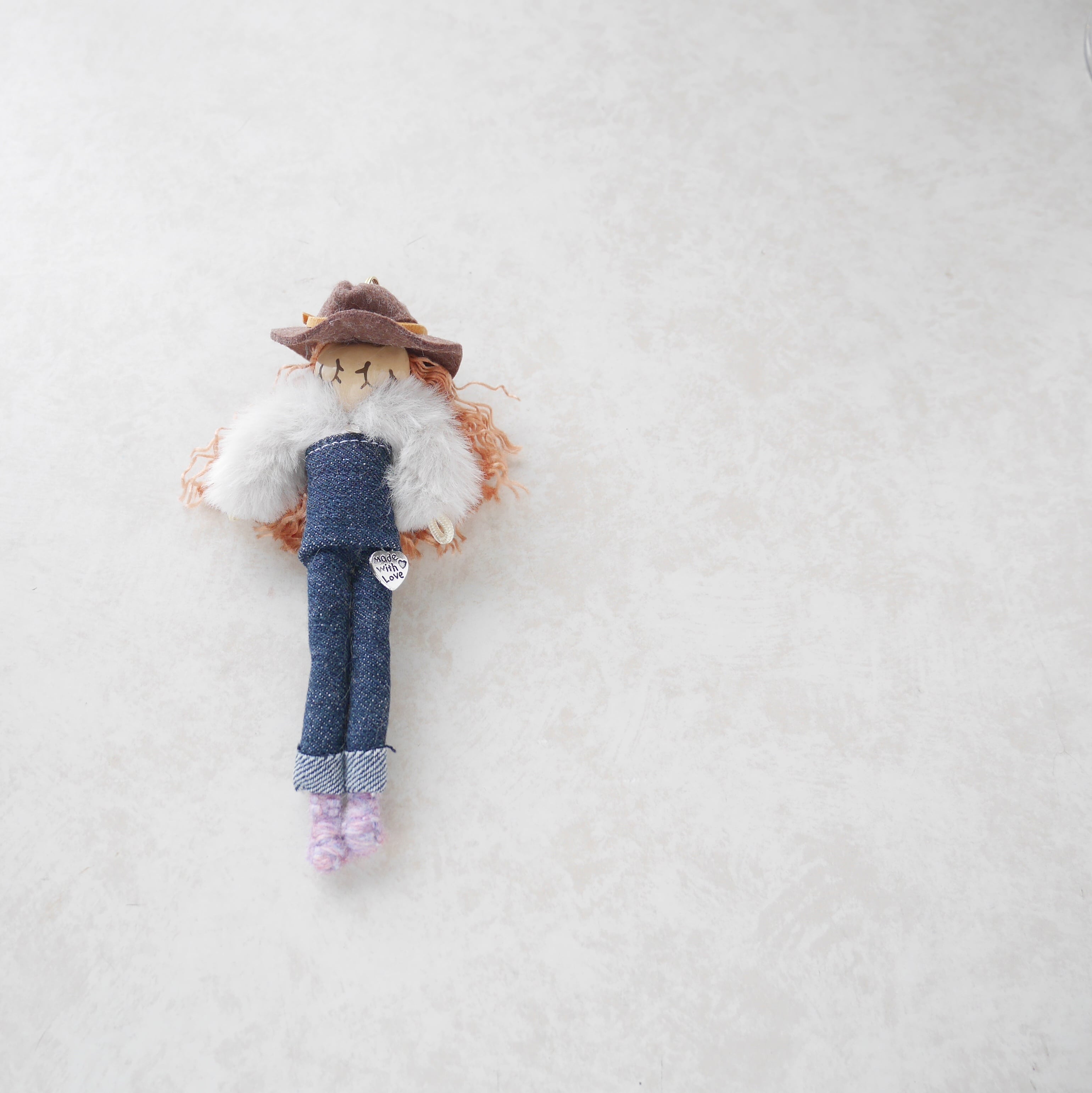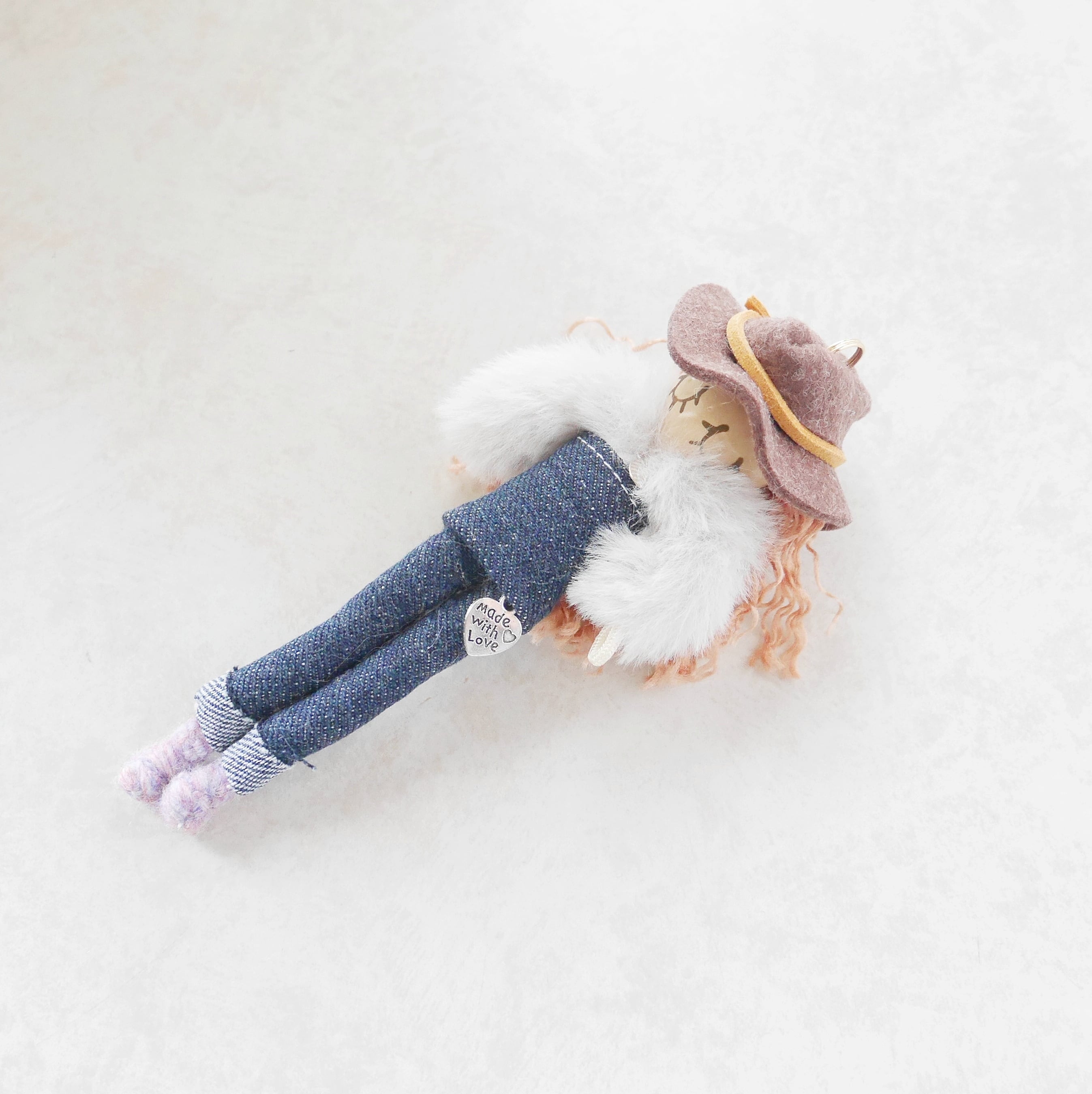大人っぽい細めサロペットを着たドールに、ふわもこがキュートをプラス。