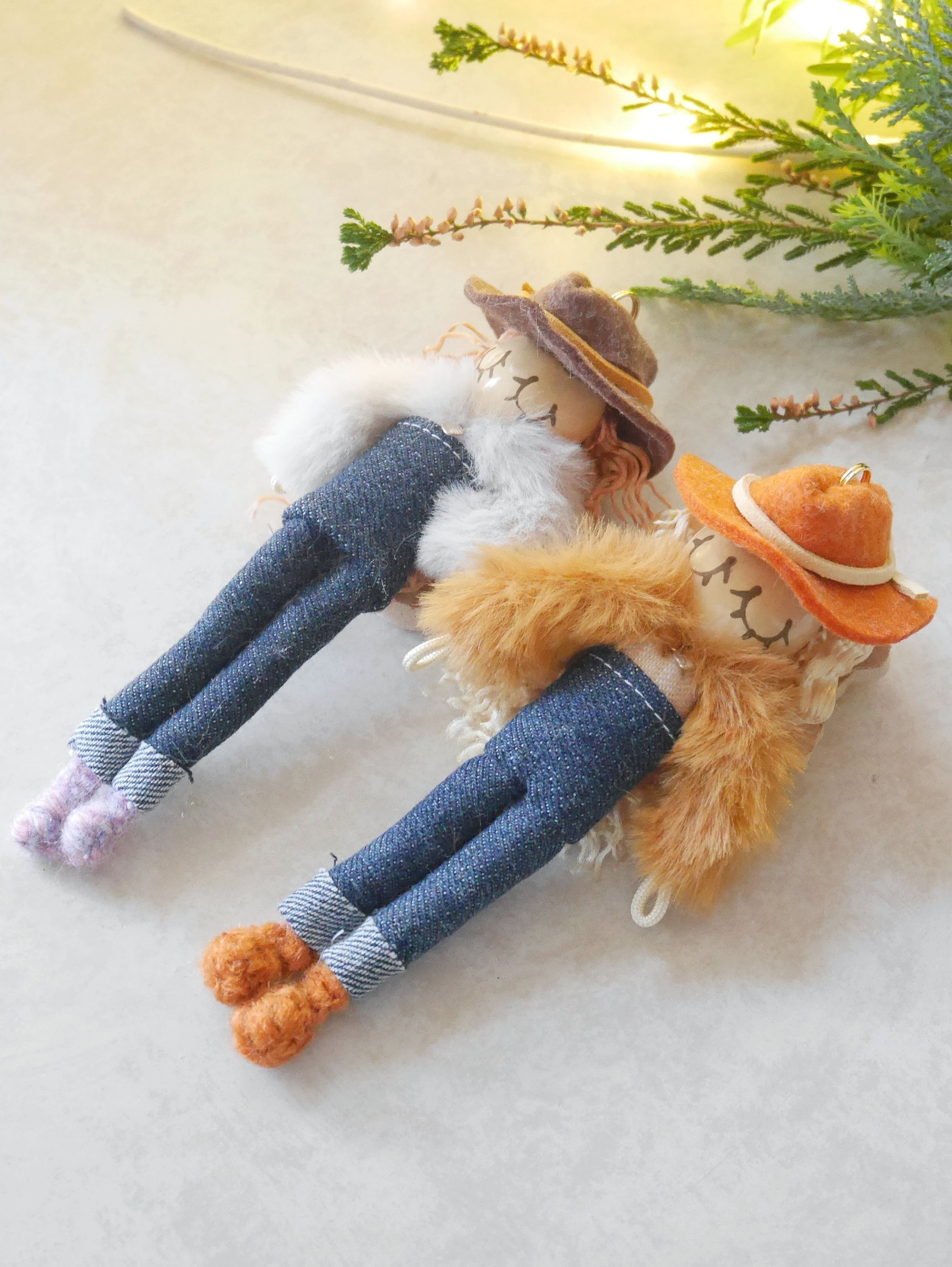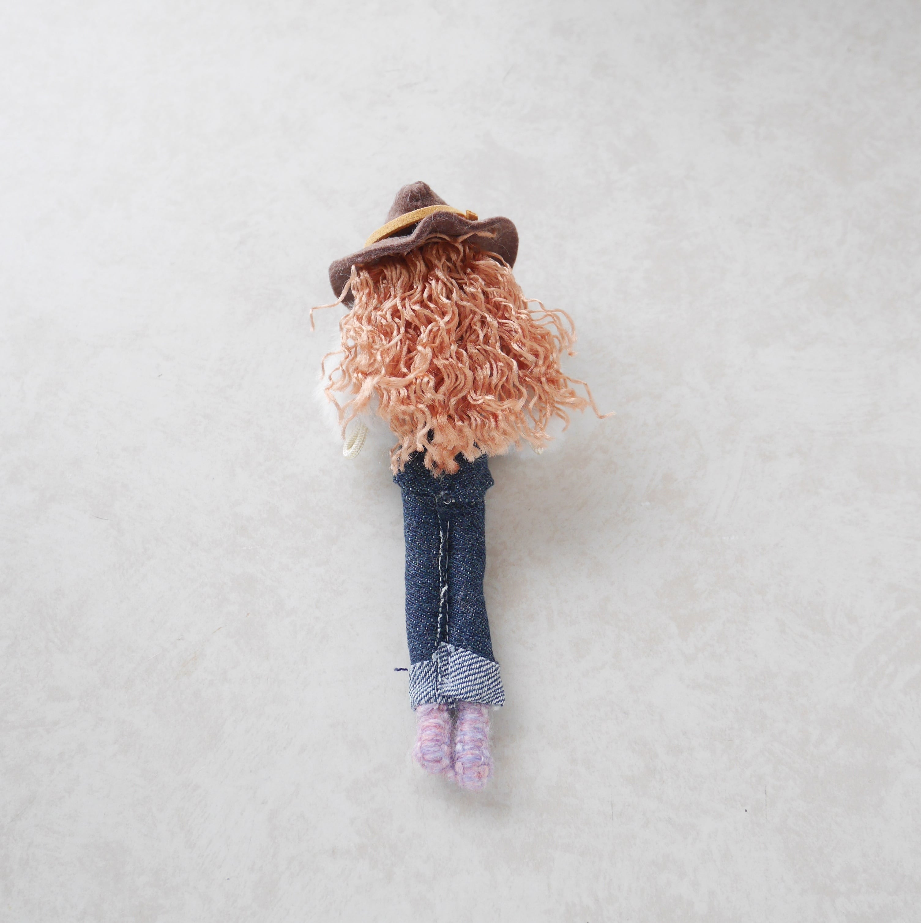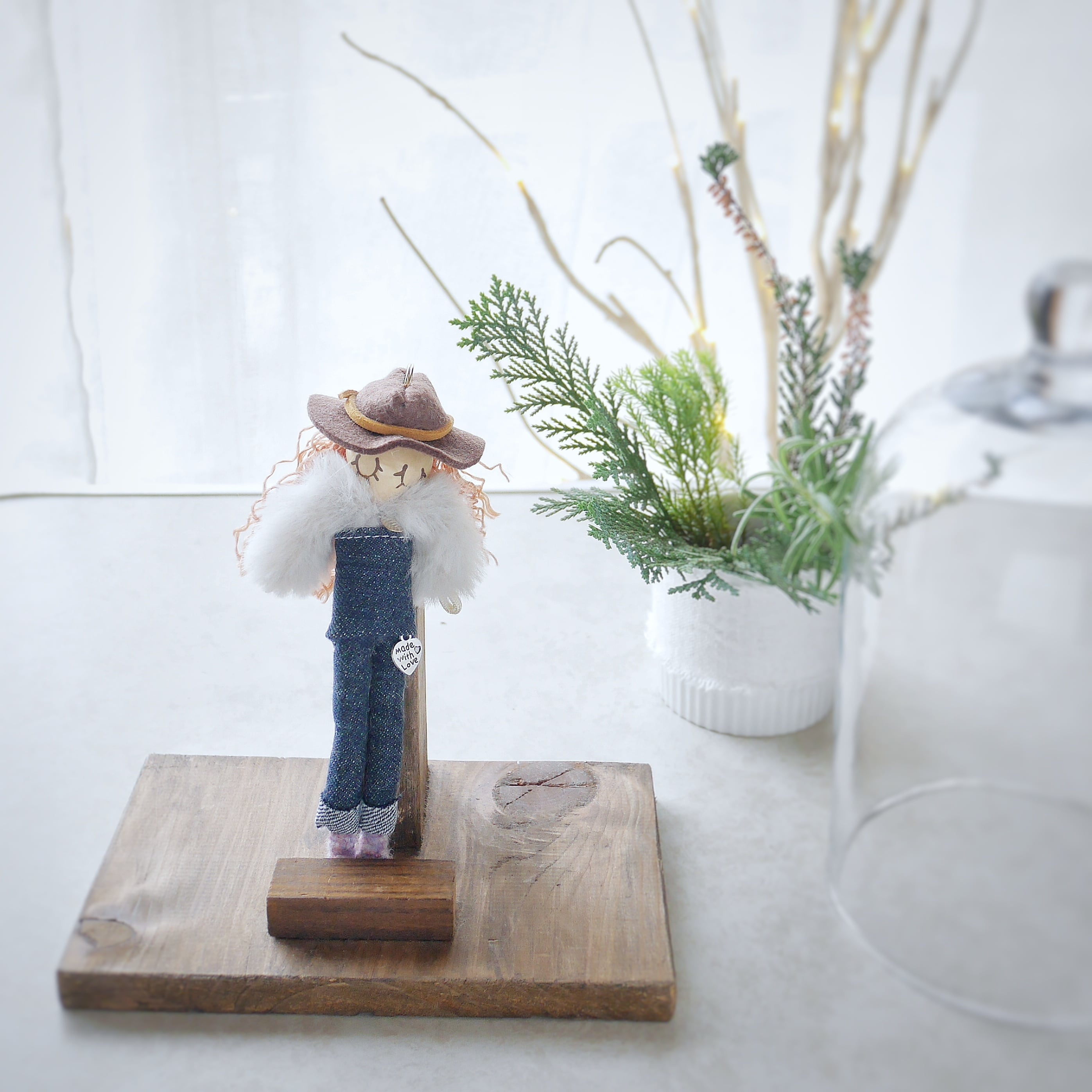 大人っぽい細めサロペットを着たドールに、ふわもこがキュートをプラス。