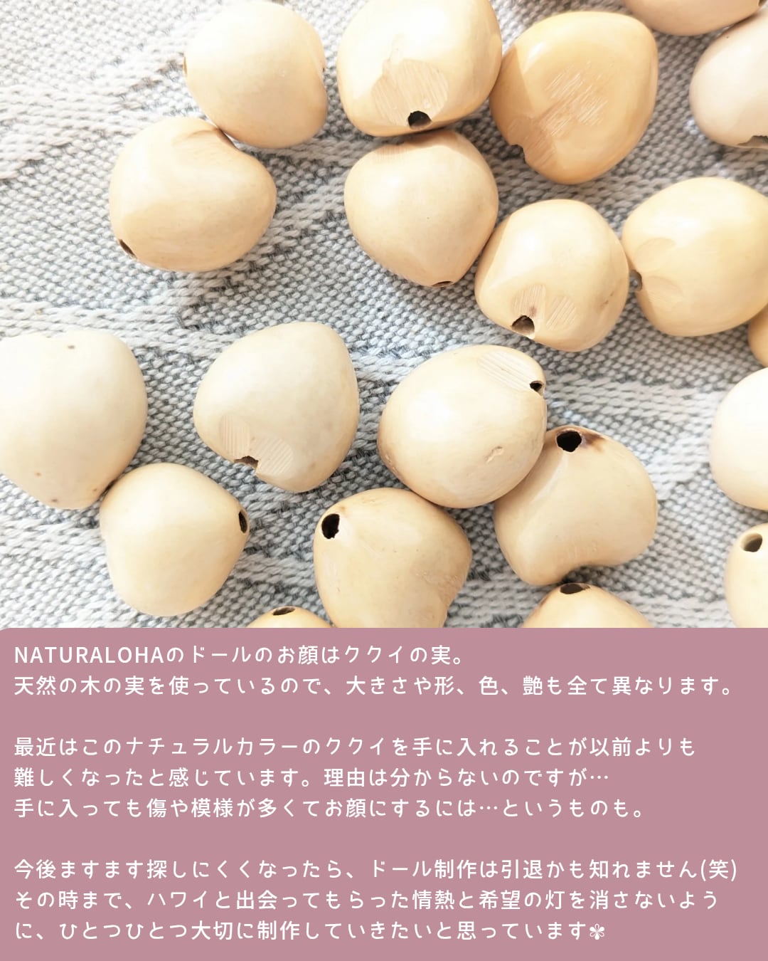 NATURALOHA(ナチュラロハを読みます)は、ククイナッツをお顔にしたちょっと珍しいドールを作っているブランドです。作家自ら、ハワイとの関わりの中で、インスピレーションを受け10年以上に渡り制作しています。フラを踊るときにネックレスとして使用するククイがある日ハート型に見え、お顔になると思い作り始めた当店オリジナルデザインです。