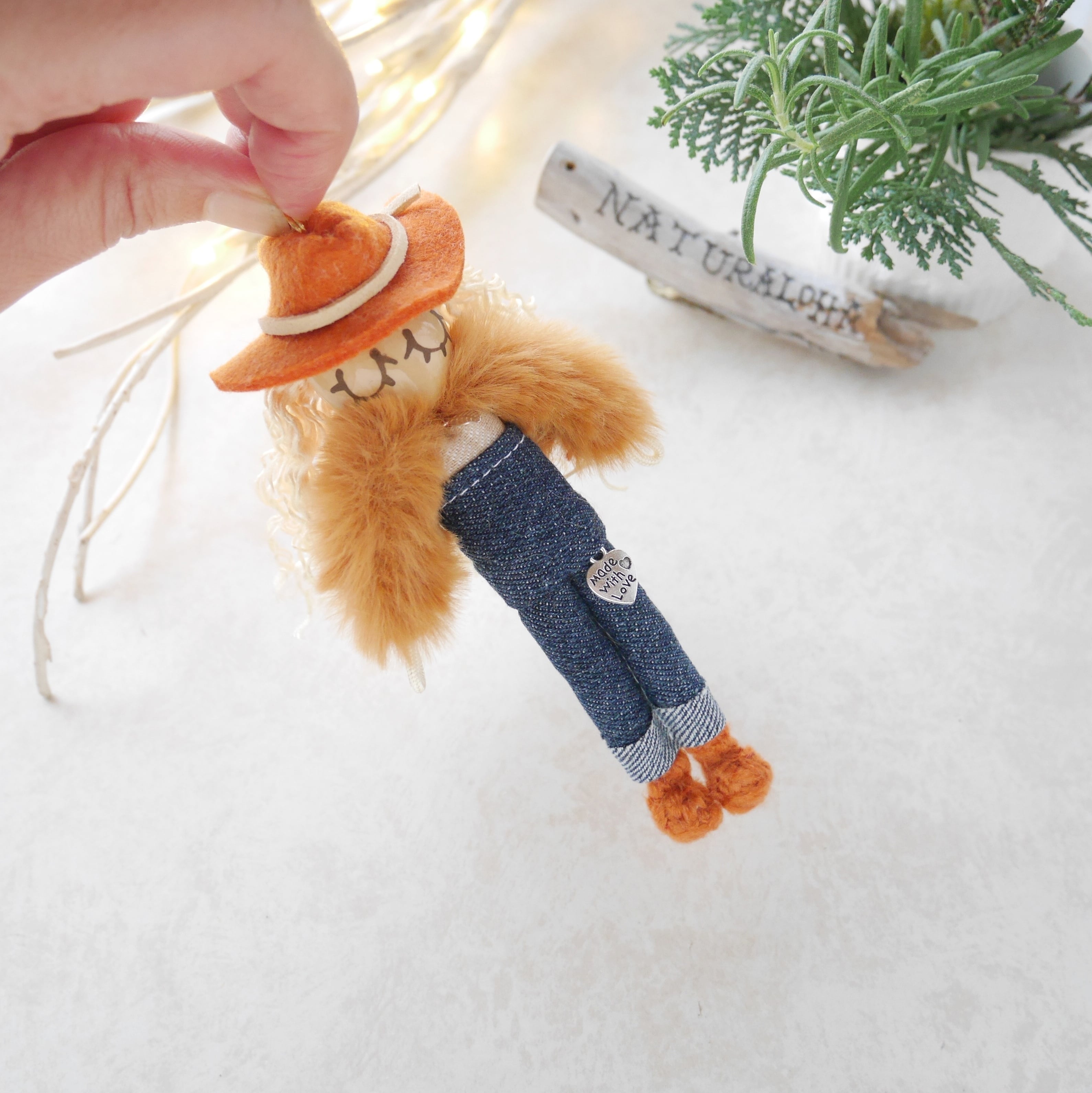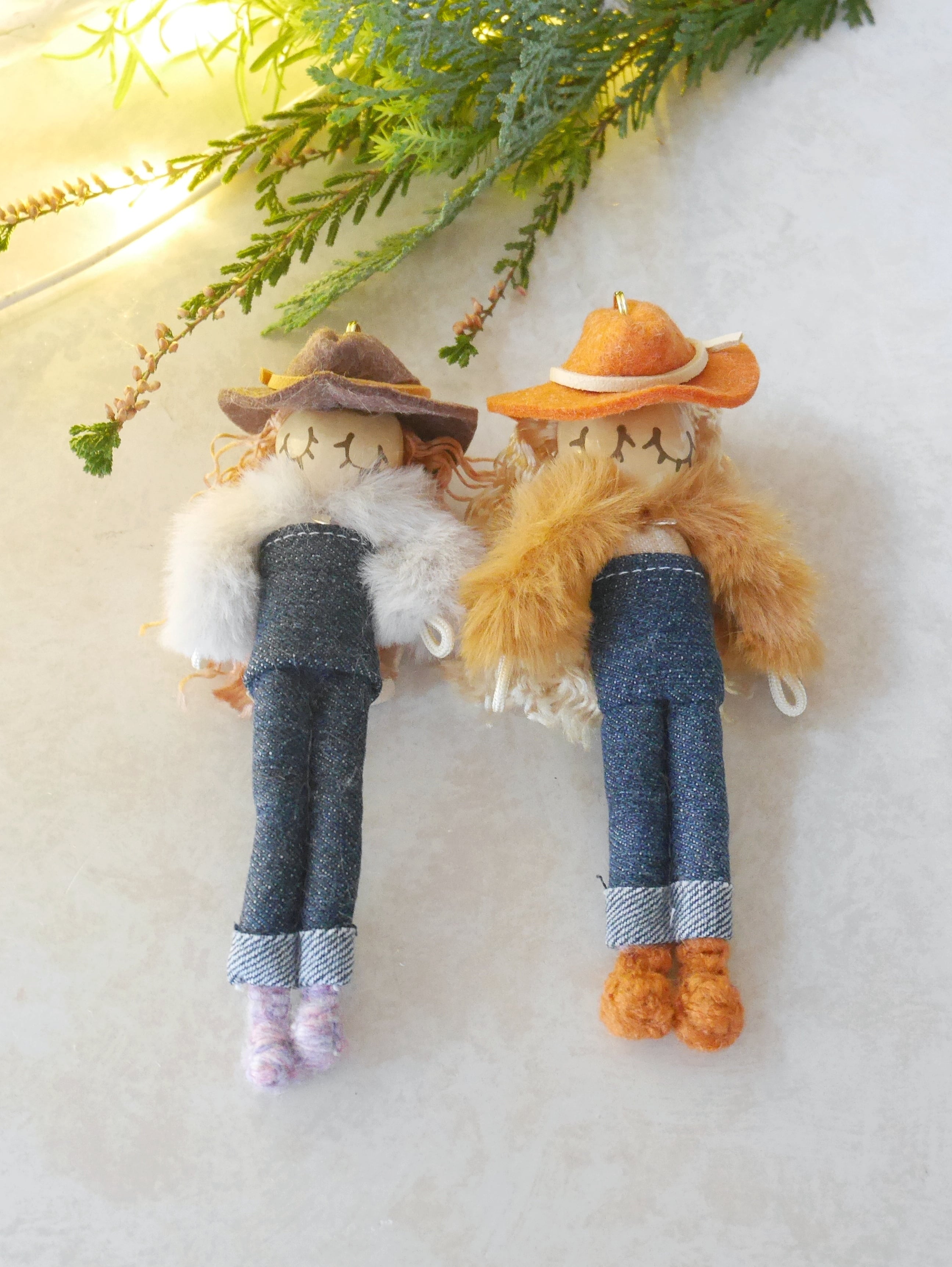 大人っぽい細めサロペットを着たドールに、ふわもこがキュートをプラス。