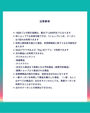 WEBストアならびにPayIDアプリどちらのお買いモノにもご利用可能なクーポンです。
