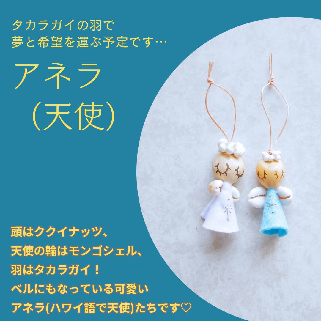 頭はククイ、天使の輪はモンゴシェル、羽にはタカラガイ!ベルにもなっている可愛いアネラ(ハワイ語で天使)は白&ブルーのツインズです。