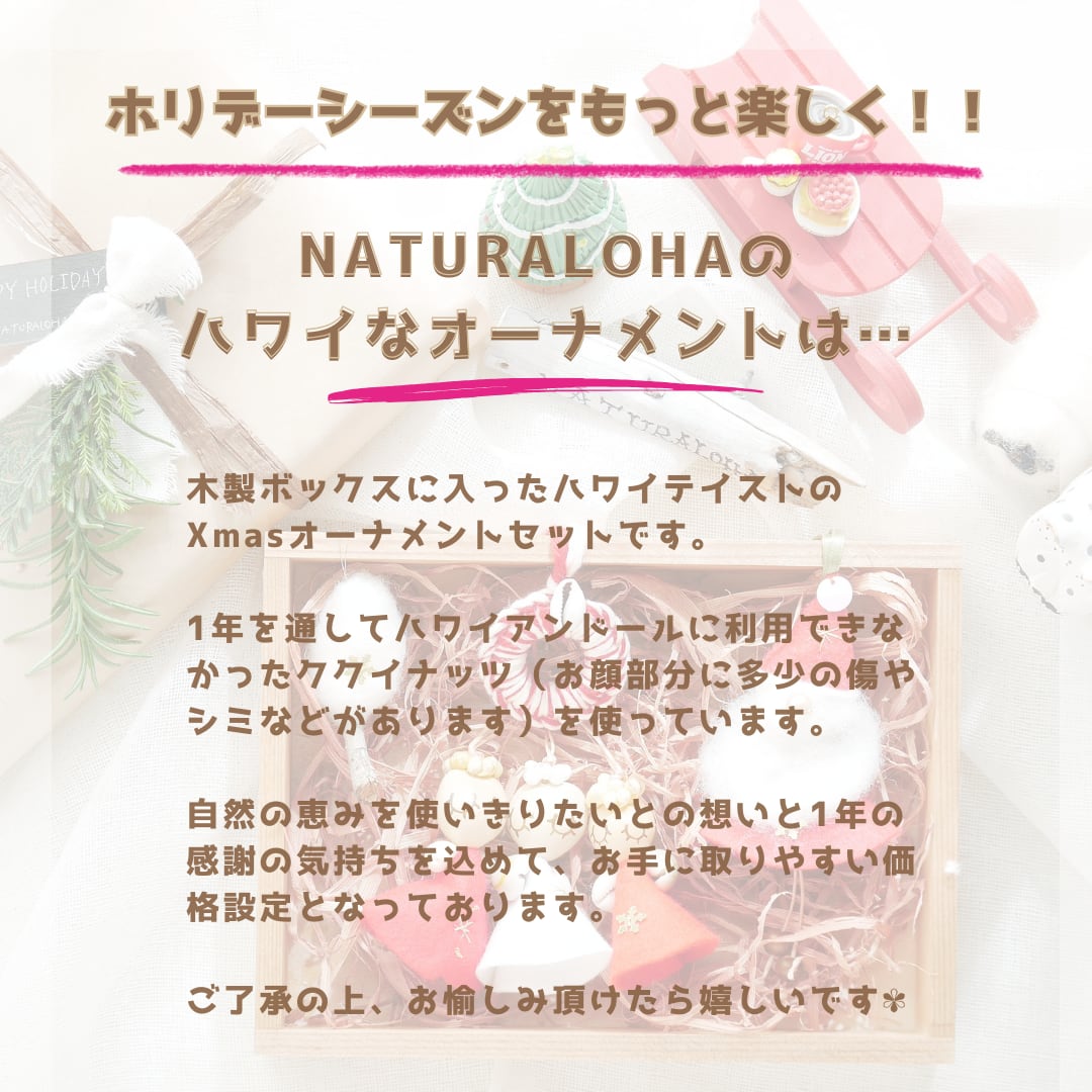 ~こちらのオーナメントは1年を通してハワイアンドールに利用できなかったククイナッツ(お顔部分に多少の傷や汚れなど)を使っています。
