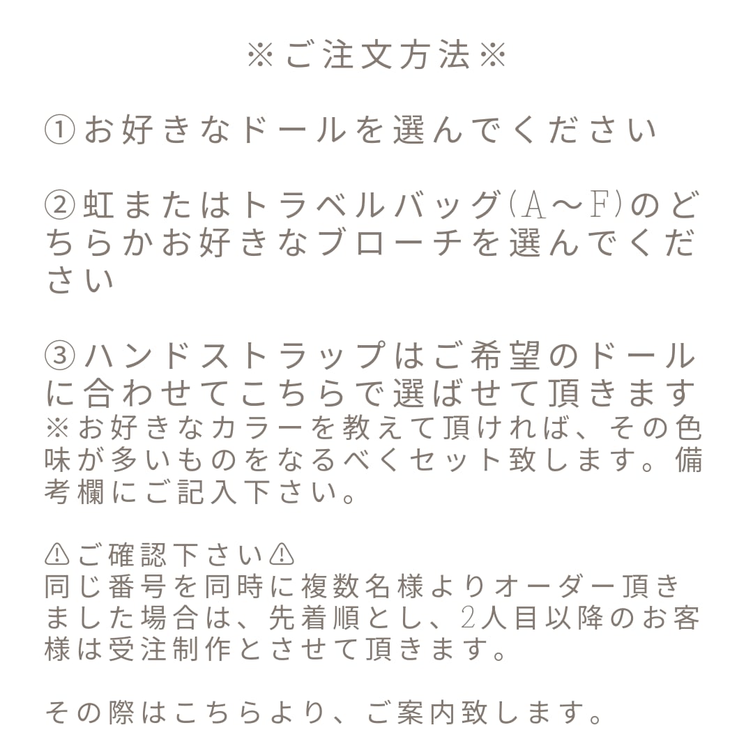ドールチャーム、ブローチ、ハンドストラップはどれも1点ものとなります。