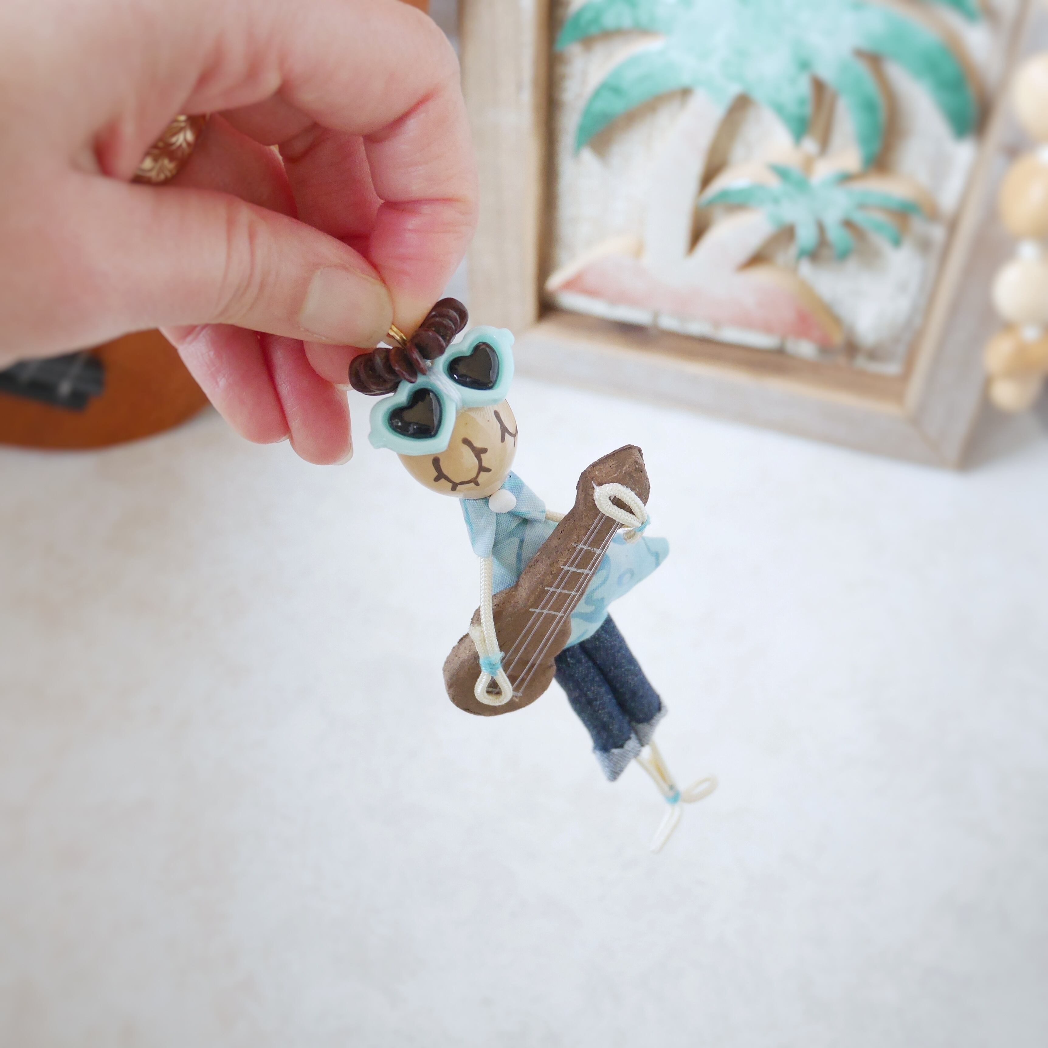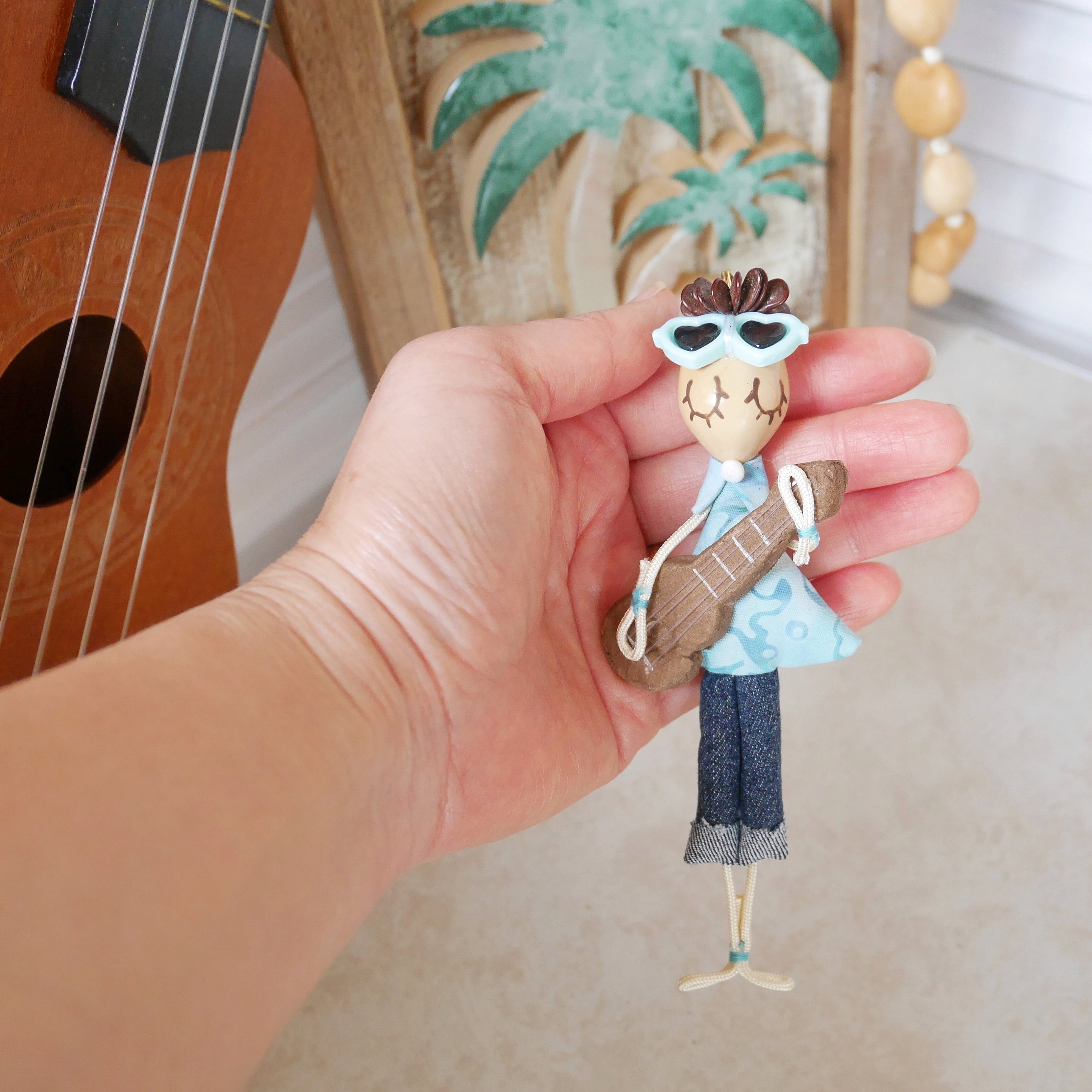 ククイナッツ(ククイの木の実)※をお顔にした手のひらサイズのキュートなウクレレボーイです。バッグチャームやお部屋のインテリアとして、車のミラーに下げたり、ハワイ気分をお好きな場所で愉しんでいただけます。