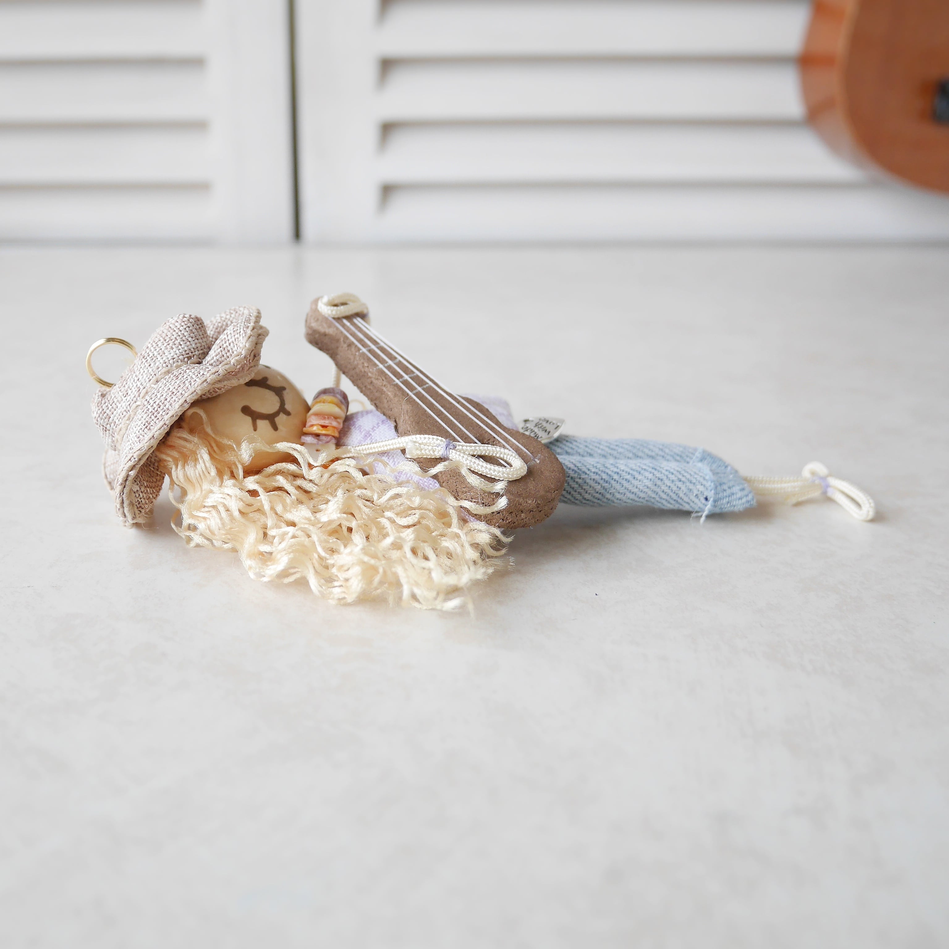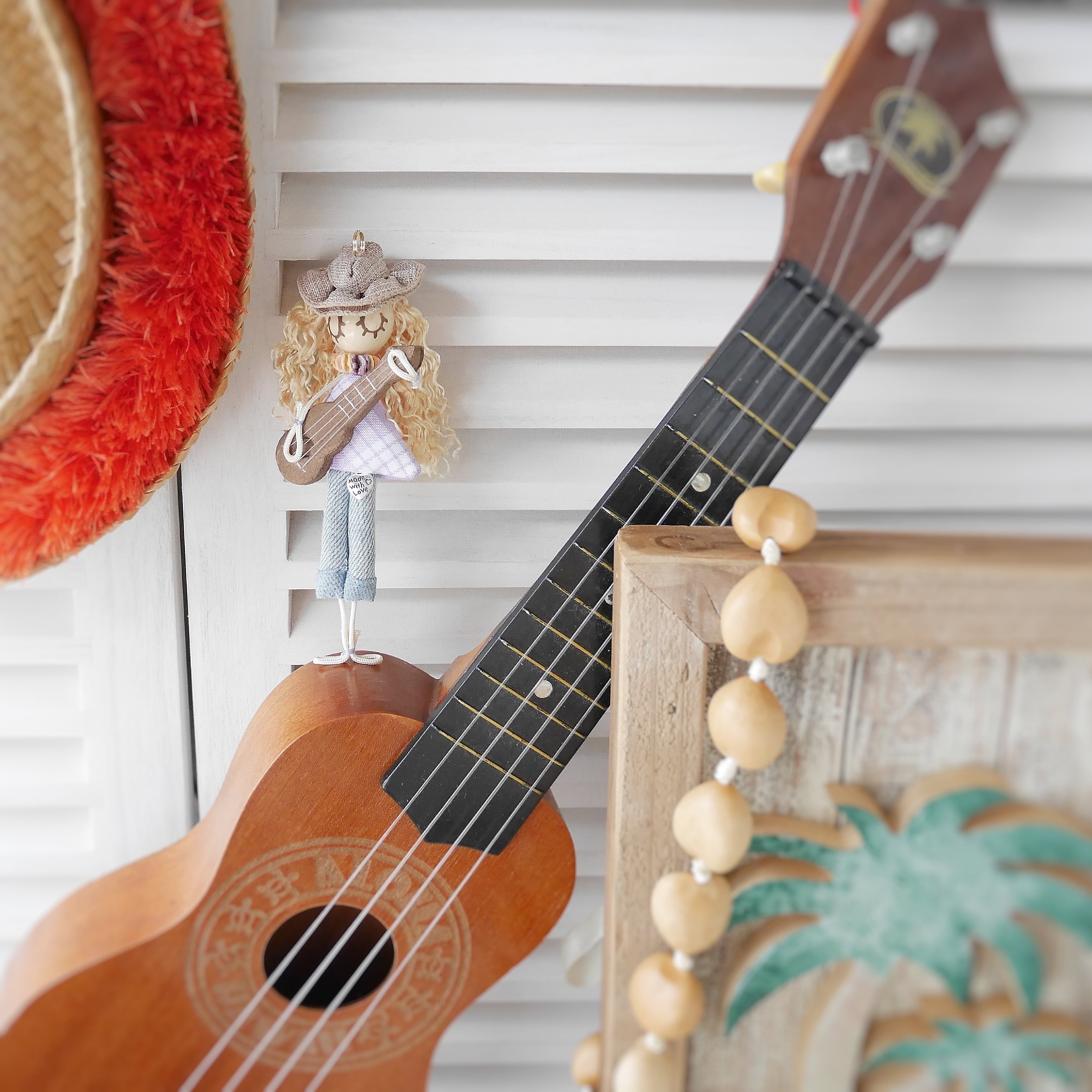 春夏にぴったりな薄手の素材で仕上げたハットを被ったウクレレガール。大きさの異なるククイナッツに合わせるために、一つひとつ手作業で調整して被せています。手間暇掛けた分だけ、とってもオシャで可愛い雰囲気になりました♡