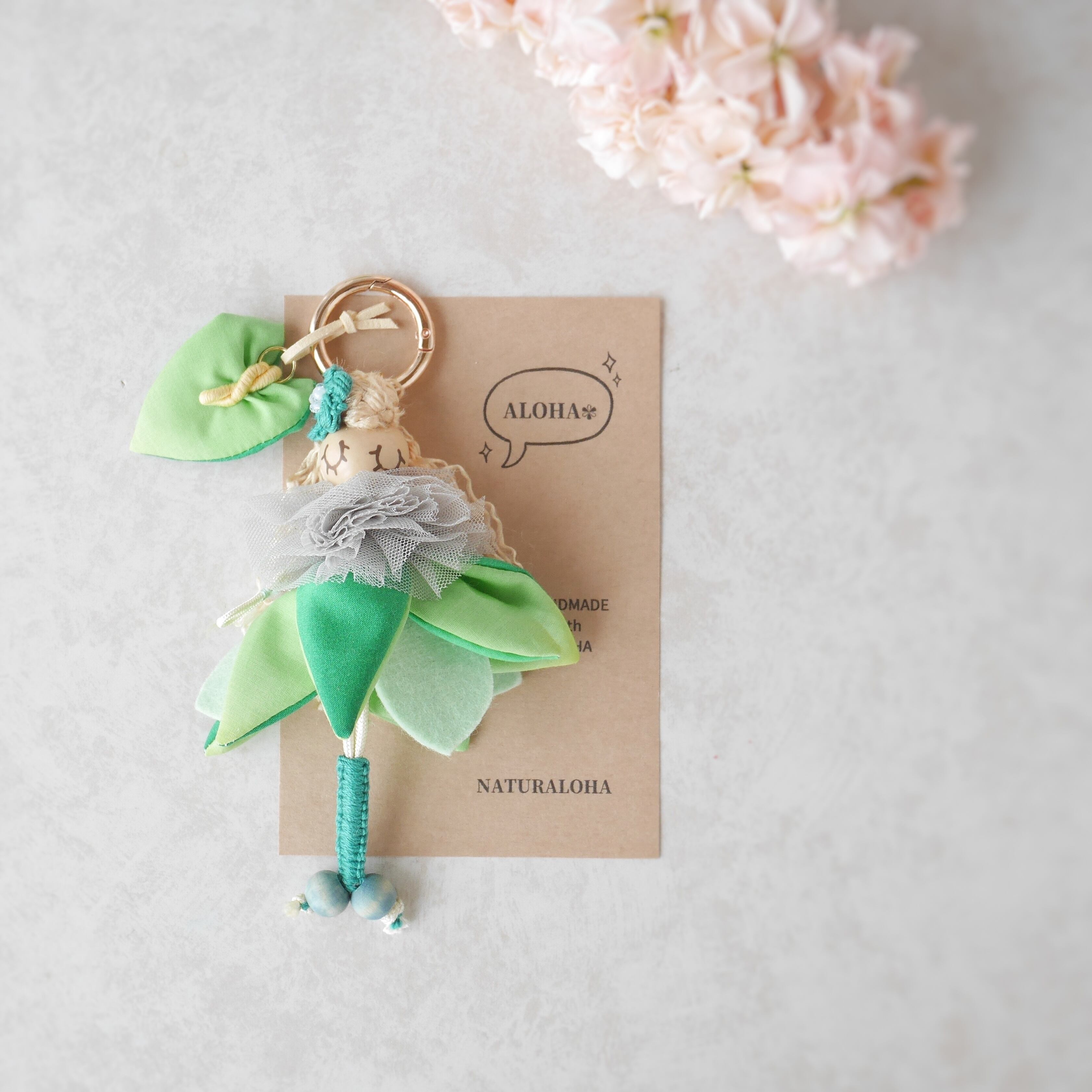 初めてのドールを手にしていただく方へ感謝を込めて、小さなお花チャームを添えてお届けします♡別名「Heart of Hawaii」と呼ばれるアンスリウムをイメージしてスカートと同じファブリックで制作しました。アンスリウムは色によって花言葉が異なるようです。代表的な赤いお花は「情熱」だとか。一緒につけても、別々に楽しんでも♪ハートのカタチをしたアンスリウムにMahaloを込めて…