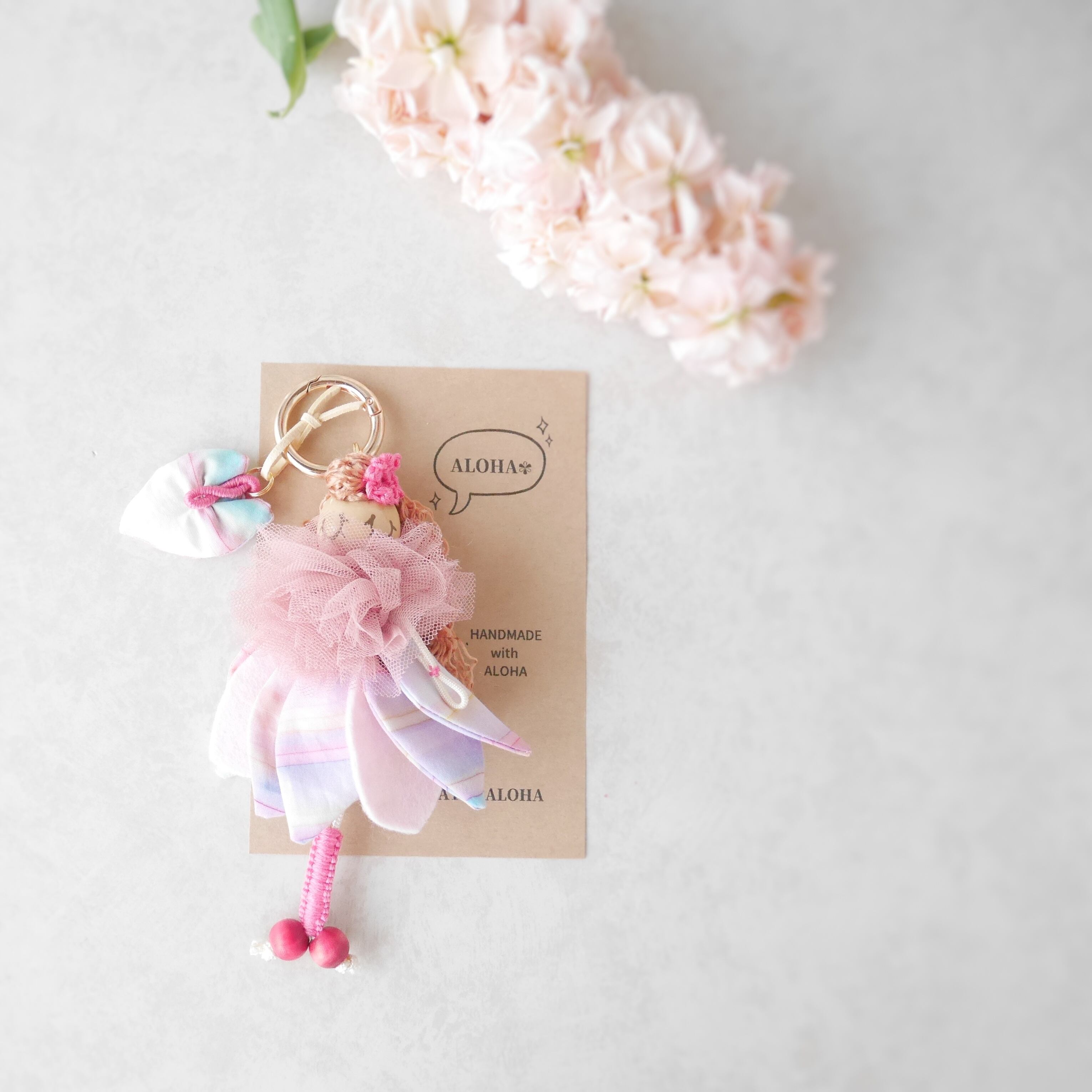 初めてのドールを手にしていただく方へ感謝を込めて、小さなお花チャームを添えてお届けします♡別名「Heart of Hawaii」と呼ばれるアンスリウムをイメージしてスカートと同じファブリックで制作しました。アンスリウムは色によって花言葉が異なるようです。代表的な赤いお花は「情熱」だとか。一緒につけても、別々に楽しんでも♪ハートのカタチをしたアンスリウムにMahaloを込めて…