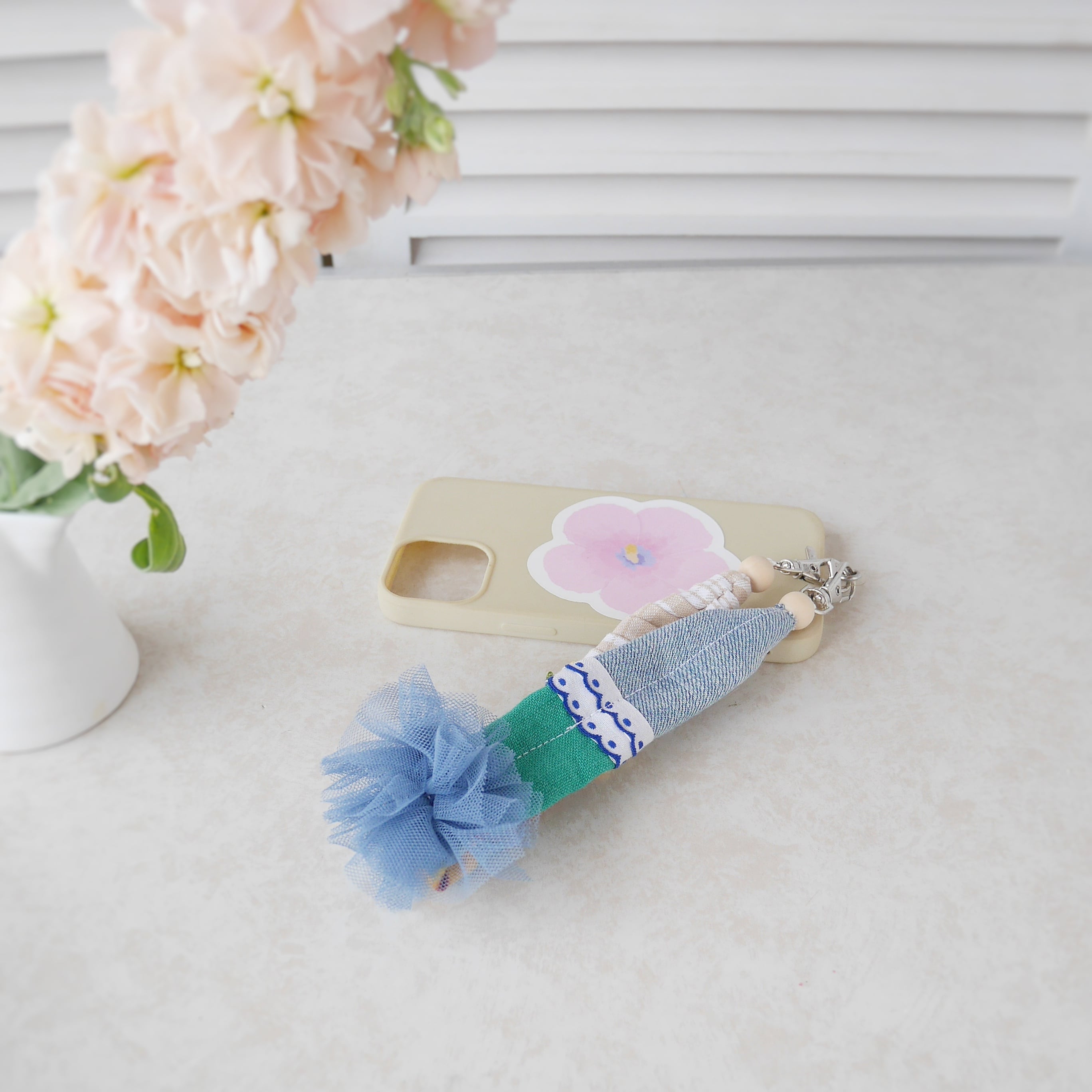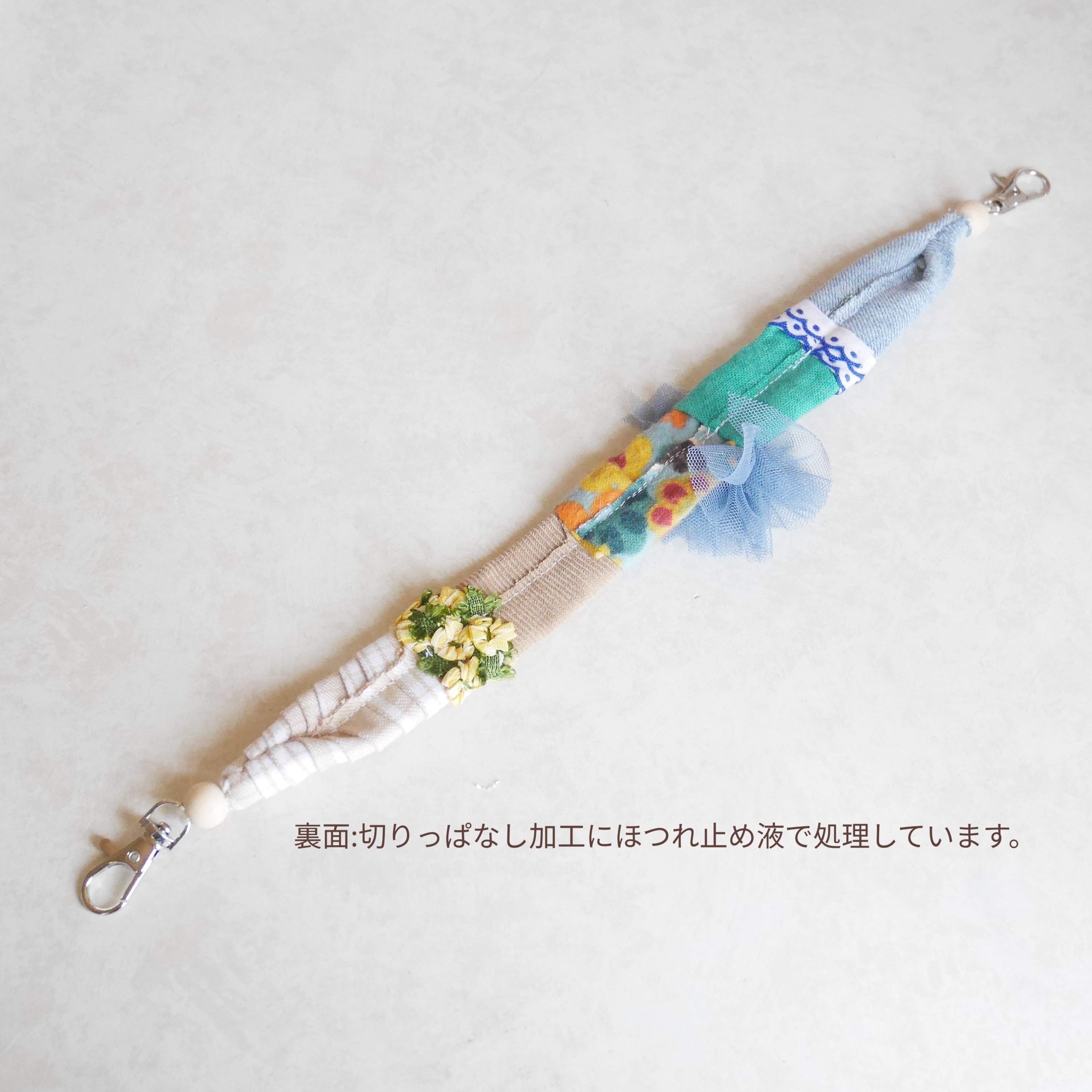 彩りを重視して様々な異素材を組合せた世界にひとつのハンドストラップです。