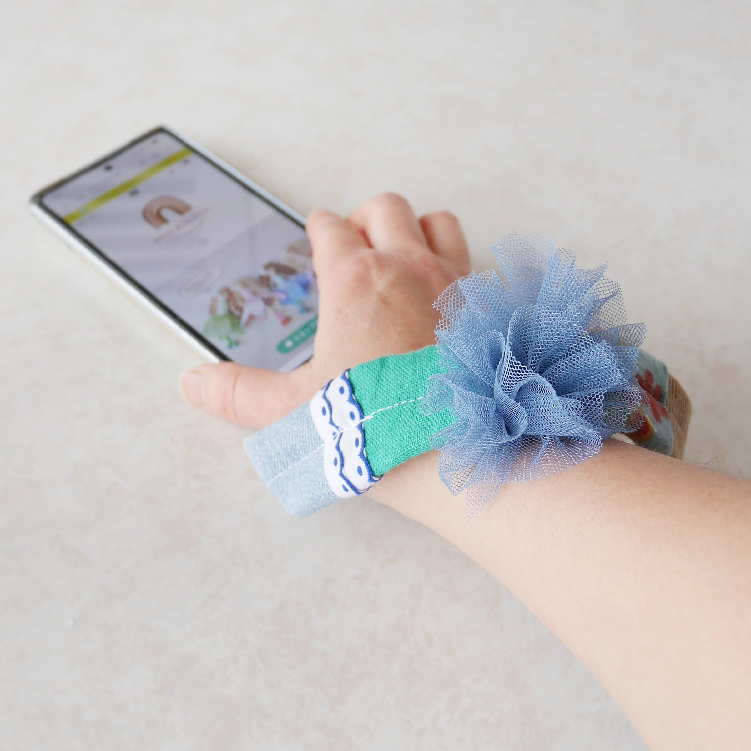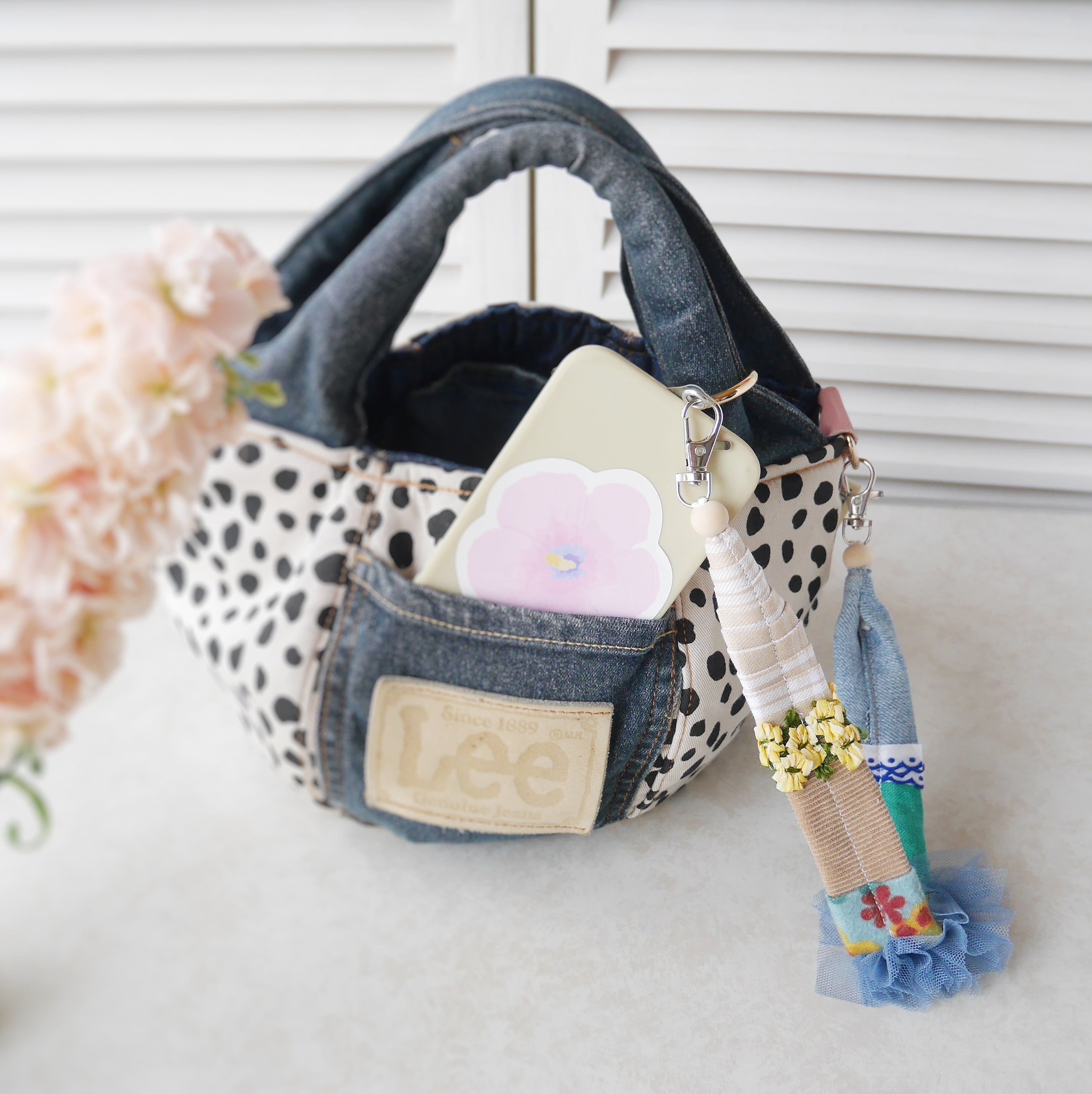 切りっぱなしのデニム、お花のリボン、シフォン生地、ウルヴェヒヤーン、本革、などなど様々な素材をミックスしながら、同じモノが二つとない作品になっています。