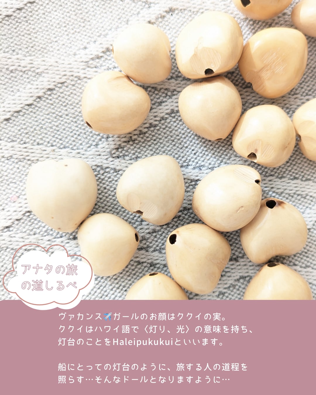 ある日突然、ククイナッツがお顔のカタチに見えたことから作者の手の中で生まれた小さなハワイアン&フラドール。ククイナッツが持つメッセージ〈灯り〉に願いを重ね、ココロにじんわり灯りがともるハワイアンドールを制作しています。
