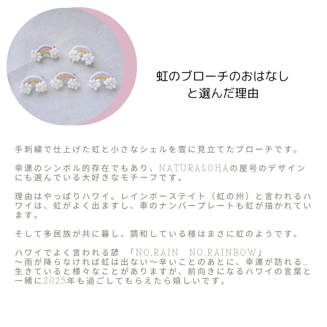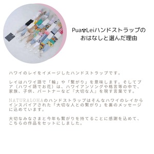 「ハワイアンドールチャーム」はもちろんのこと、ハワイといえば…虹!という位にハワイラヴァーにとってはラッキーアイテムな「手刺繍虹のブローチ」、ハワイアンレイをイメージしている「Pualei✾ハンドストラップ」をご用意します。