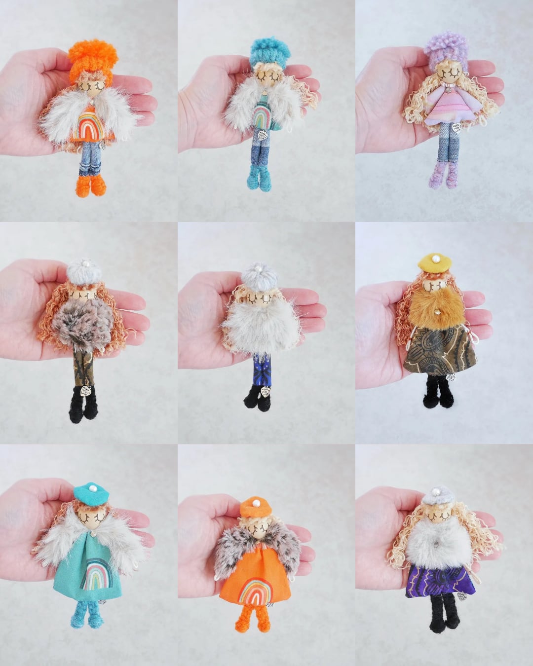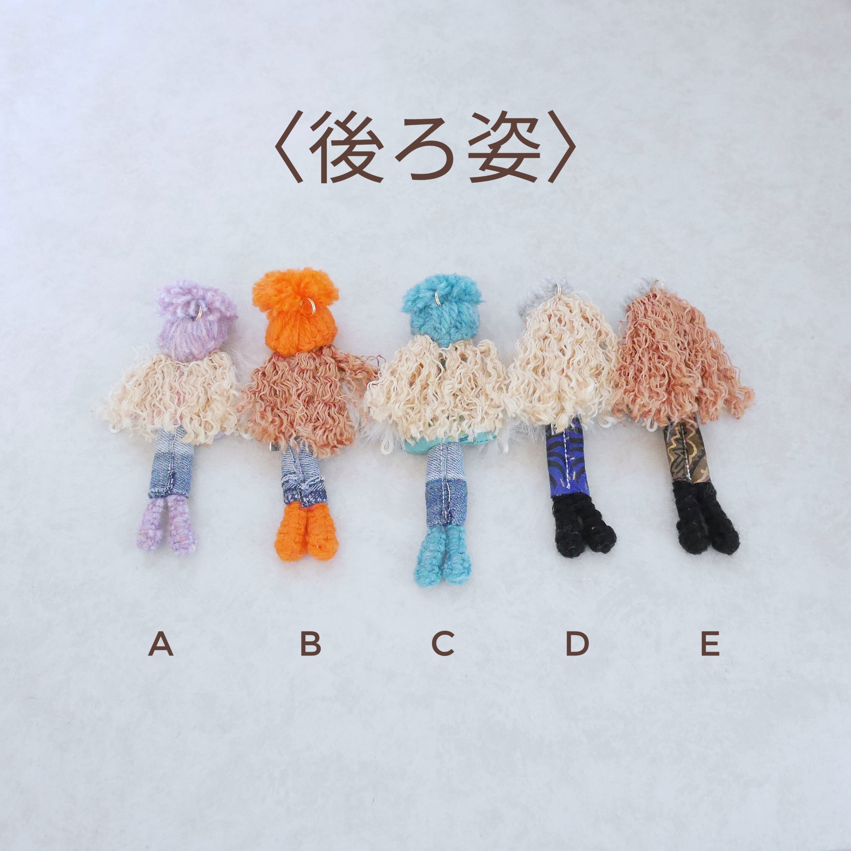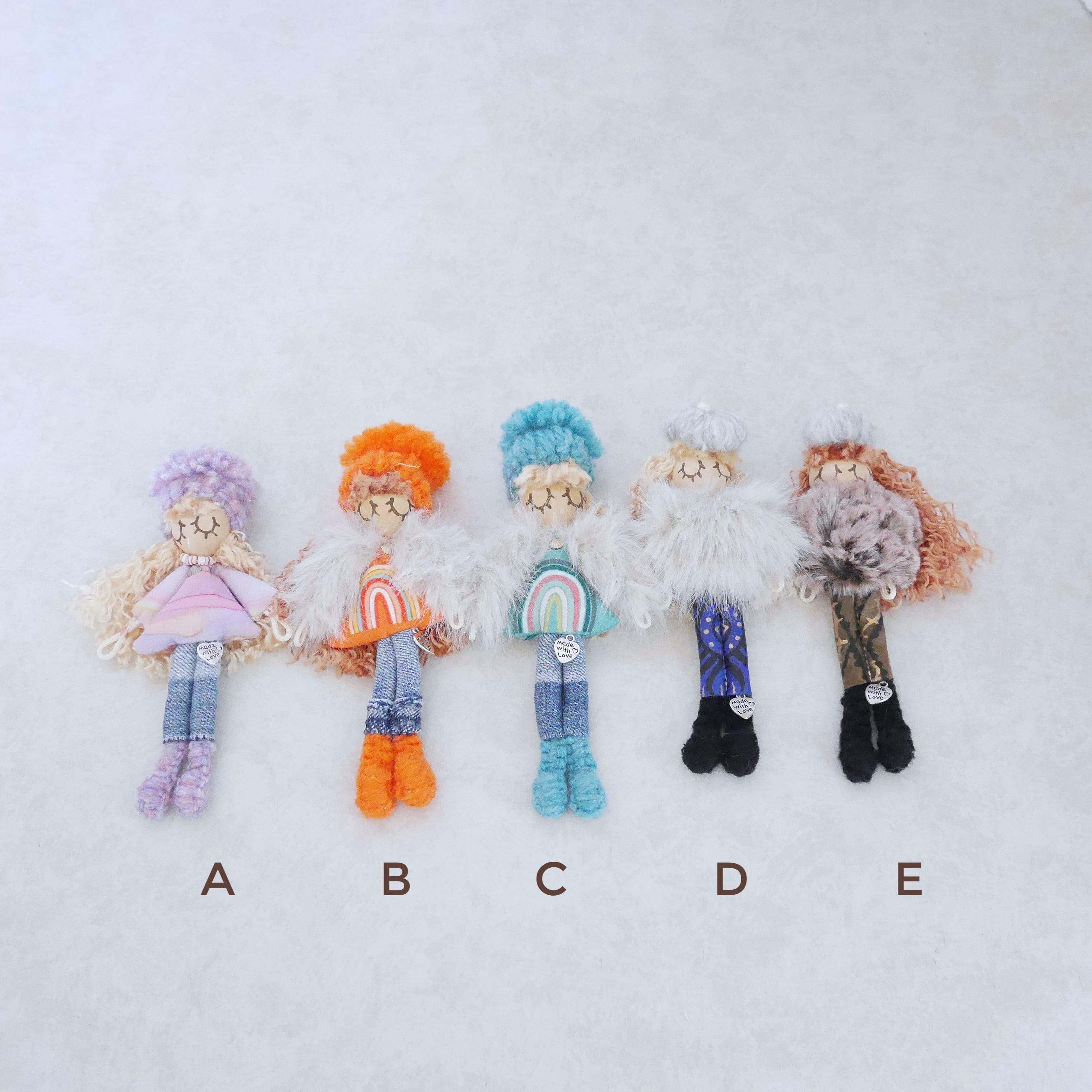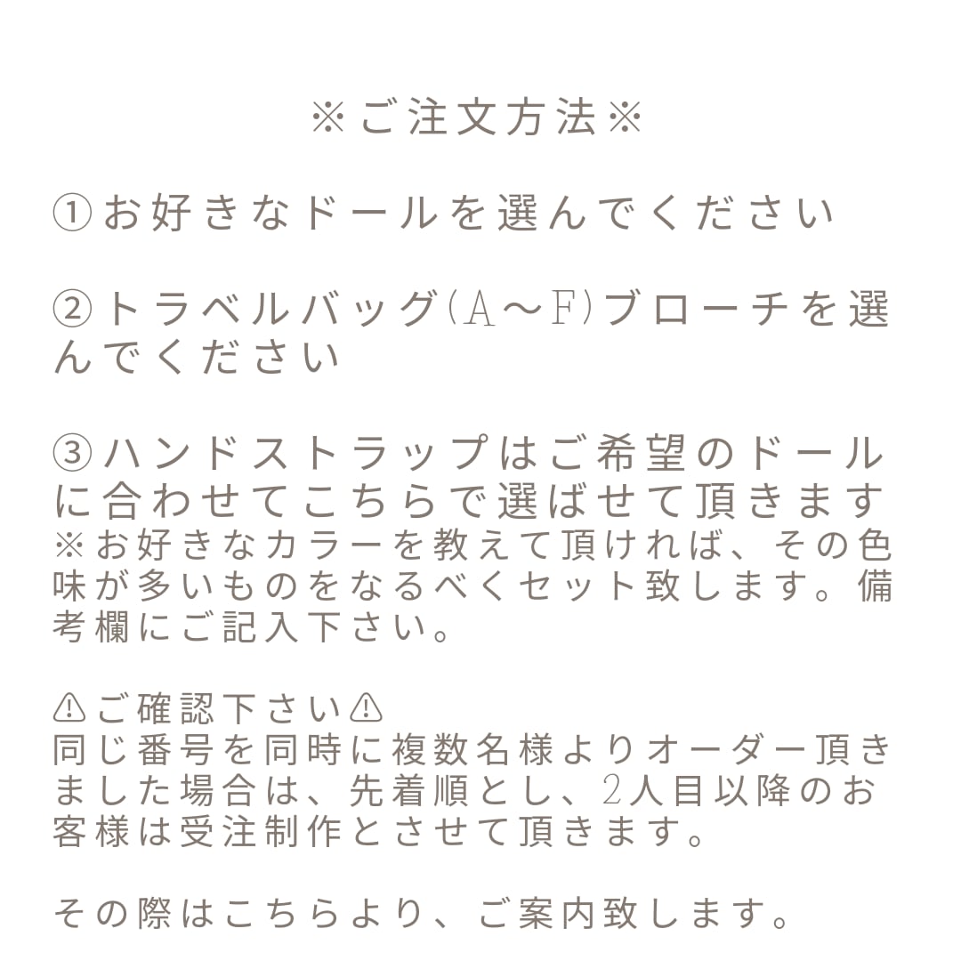 ドールチャーム、ブローチ、ハンドストラップはどれも1点ものとなります。