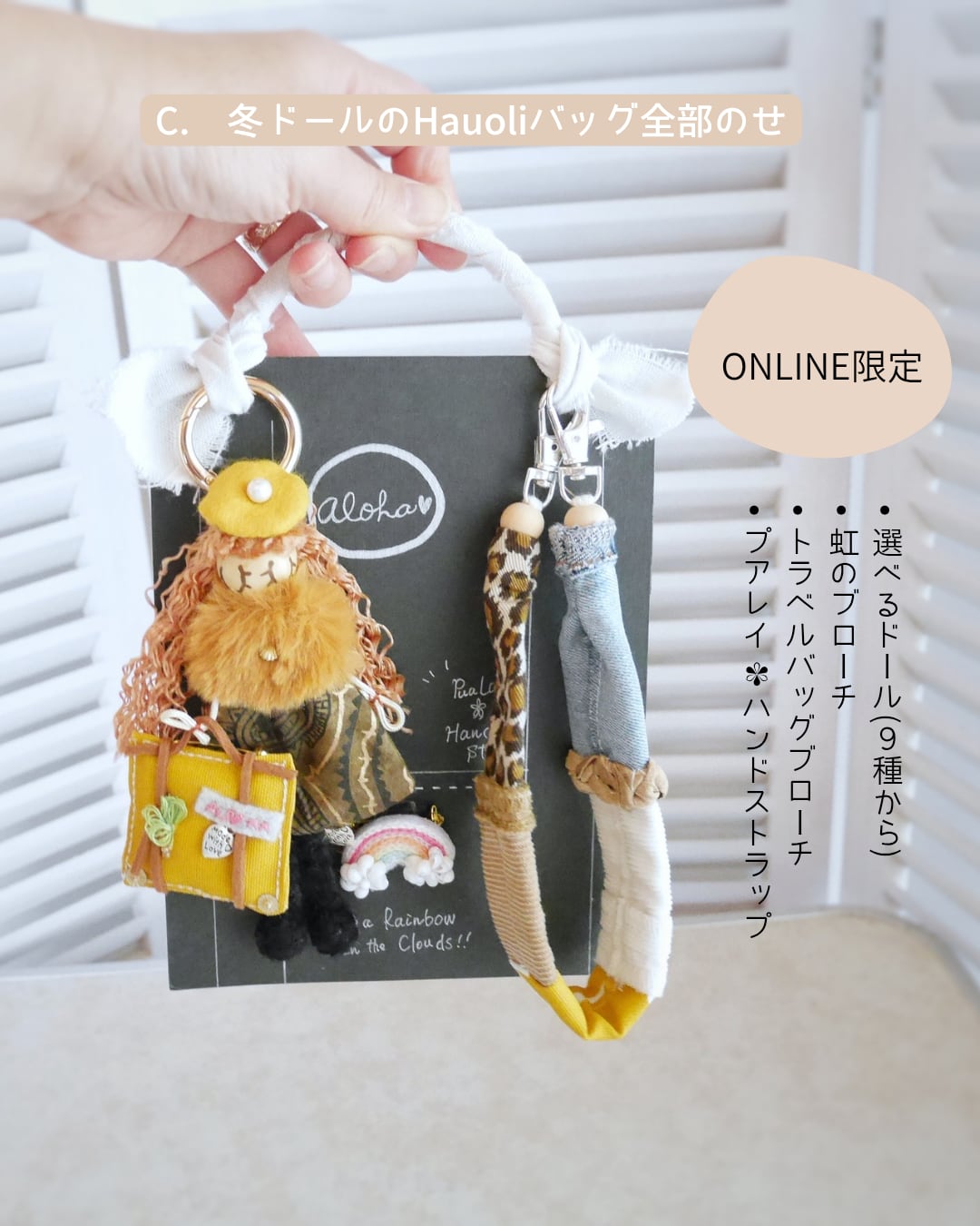 選べるドールとNATURALOHAの人気作品のブローチ2点、プアレイハンドストラップを全て盛り込んだハウオリ盛り盛りセットにしました。